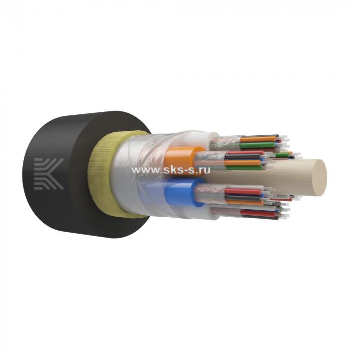 кабель имеет оптический сердечник модульной конструкции, состоящий из центрального силового элемента в виде стеклопластикового прутка в полимерной оболочке (или без неё), вокруг которого скручены оптические модули (ОМ) и (при необходимости) кордельные заполнители из полиэтиленового стержня. Внутримодульное и межмодульное прострaнство заполнено гидрофобным заполнителем или другими водоблокирующими материалами по всей длине кабеля. Поверх сердечника наложена скрепляющая обмотка, внутренняя полиэтиленовая оболочка, периферийные силовые элементы из арамидных нитей, и наружная оболочка. Наружная оболочка из полиэтилена или безгалогенного компаунда, не распространяющего горение при групповой прокладке.